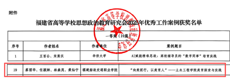 近日,福建省高等學(xué)校思想政治教育研究會公布了關(guān)于表彰2025年優(yōu)秀工作案例的通知。我院網(wǎng)絡(luò)育人工作案例《“向美而行,以美育人”——土木工程學(xué)院美育探索與實踐》獲評一等獎。