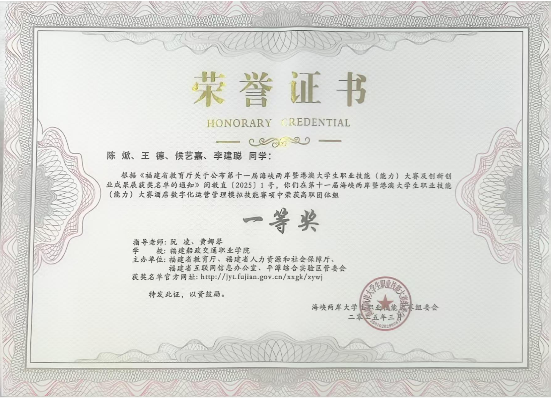 第十一屆海峽兩岸暨港澳大學(xué)生技能大賽中,榮獲酒店數(shù)字化運(yùn)營管理模擬賽項(xiàng)一等獎,展現(xiàn)了卓越的數(shù)字化管理能力;