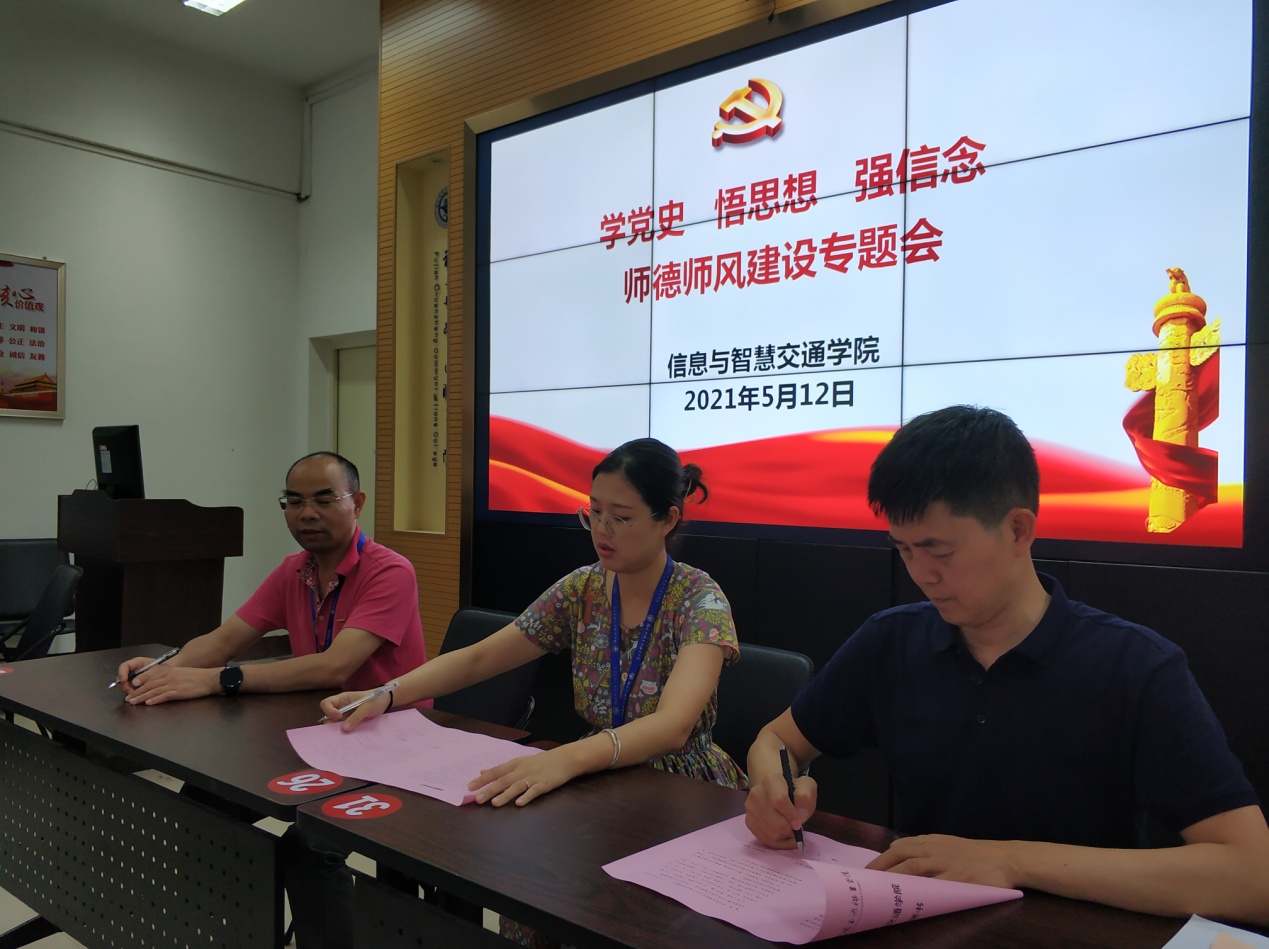 會上,學院總支書記許友孝帶領全體老師們認真閱讀了《信息與智慧交通學院師德師風承諾書》的各項內容,強調堅決不觸碰師德紅線,做一個遵守紀律的老師。最后每位老師鄭重地在《信息與智慧交通學院師德師風承諾書》上簽下了自己的名字。