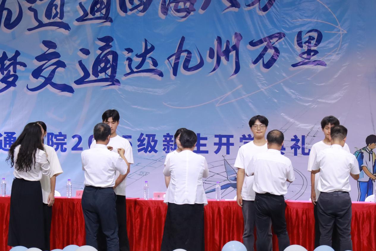 典禮現(xiàn)場最動(dòng)人的環(huán)節(jié)到來。學(xué)院領(lǐng)導(dǎo)與教師代表們手持校徽,逐一為新生佩戴。當(dāng)小小的校徽別在胸前,不僅是身份的象征,更承載著“傳承船政精神、深耕軌道事業(yè)”的期許。新生們輕輕撫摸徽章,眼中滿是激動(dòng)與堅(jiān)定——從這一刻起,他們正式以“船政人”的身份,開啟逐夢之旅。