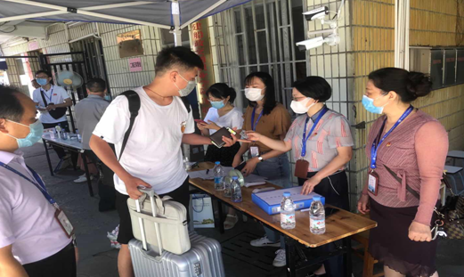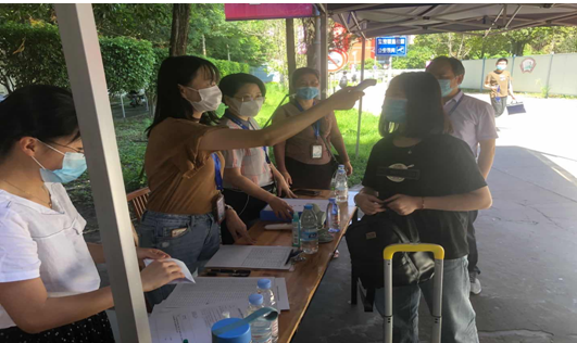 炎炎夏日,交通經(jīng)濟(jì)系全體輔導(dǎo)員老師們與共建支部的老師們輪流參與志愿工作,工作從校門口就開(kāi)始了。他們一絲不茍地一步步引導(dǎo)每一位返校同學(xué)完成手部消毒、口罩更換、體溫檢測(cè)、健康碼核驗(yàn)等工作,這一切只為每一位同學(xué)的平安。