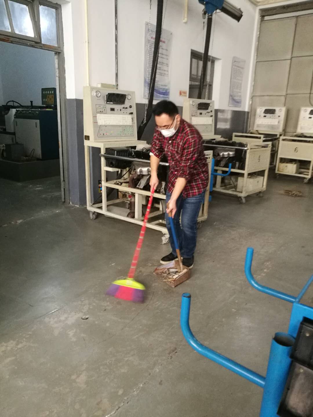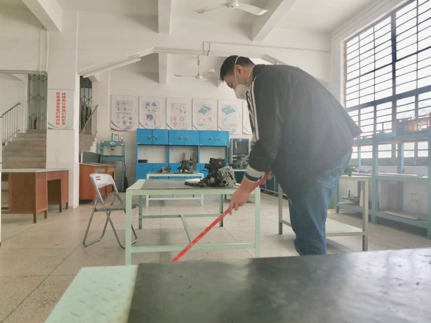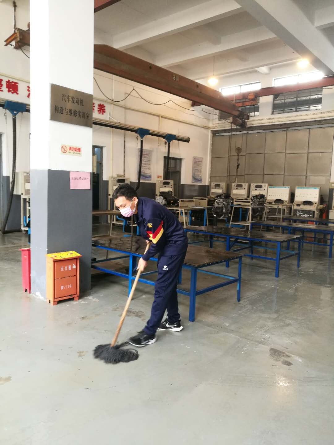 在學(xué)校值班的蔡華錦書記以身作則,拿起拖把加入了實訓(xùn)室的抗“疫”工作,與許紹炎老師、黃林火老師、陳建華老師一起認(rèn)真地打掃了新能源實訓(xùn)室、發(fā)動機構(gòu)造與維修實訓(xùn)室和底盤構(gòu)造與維修實訓(xùn)室。