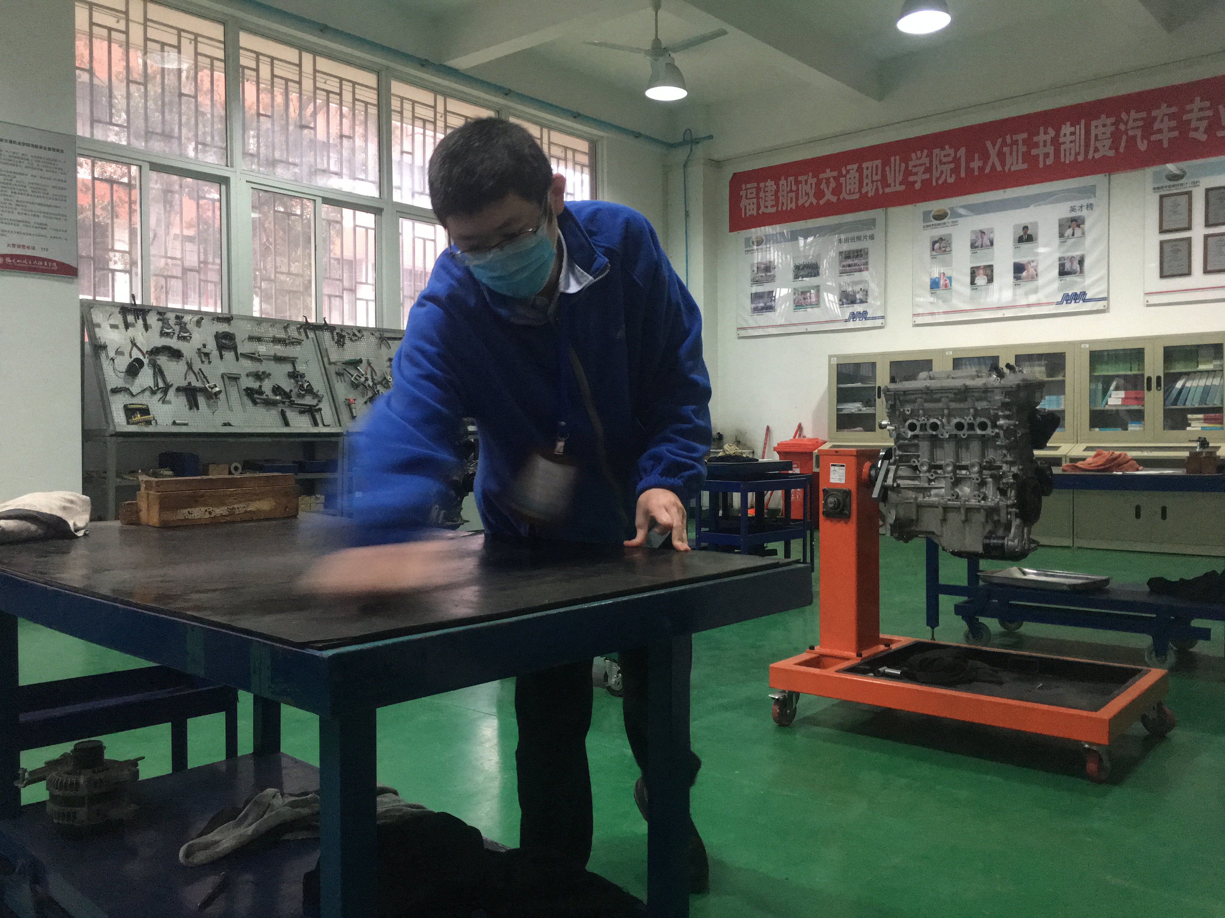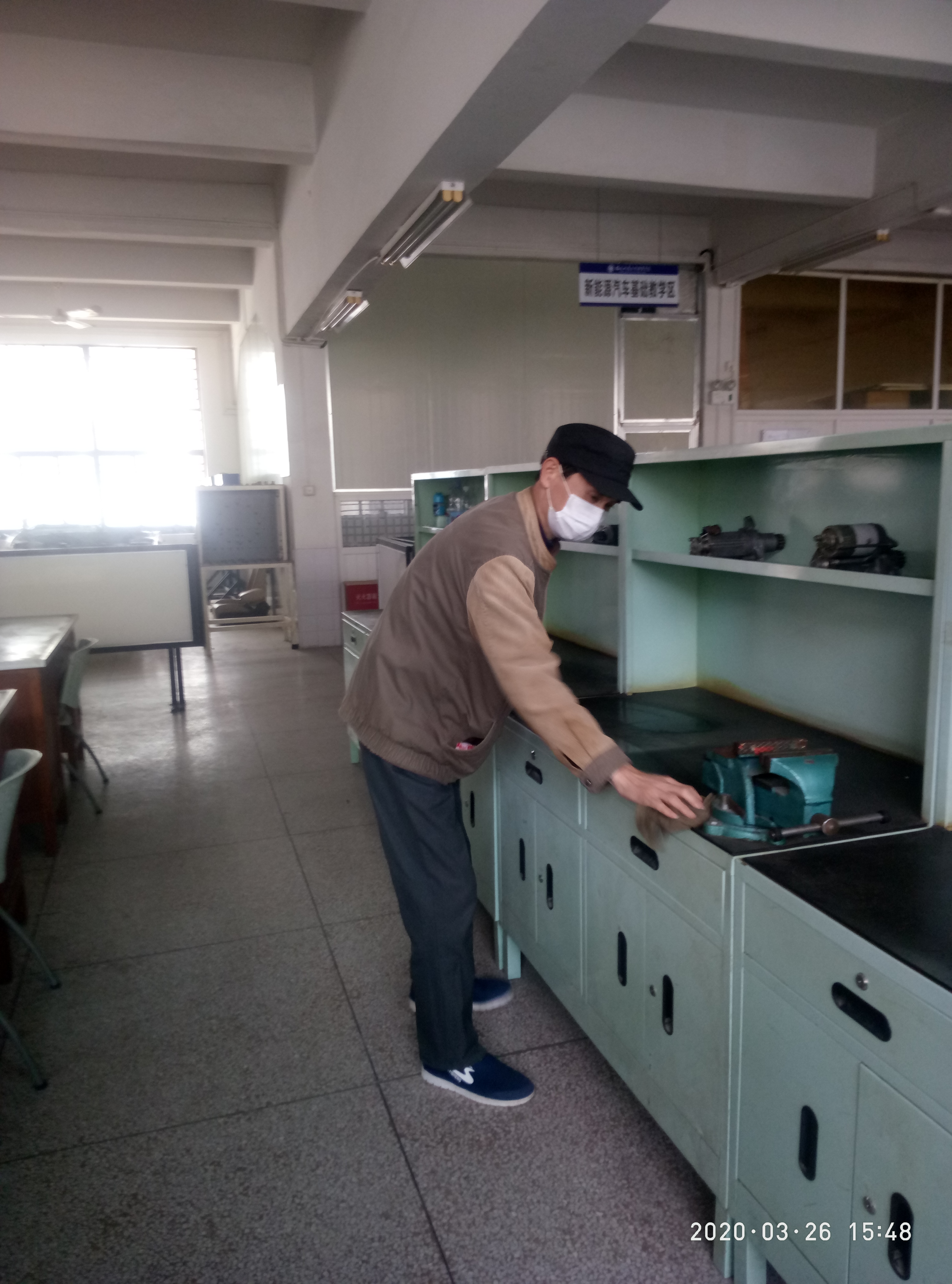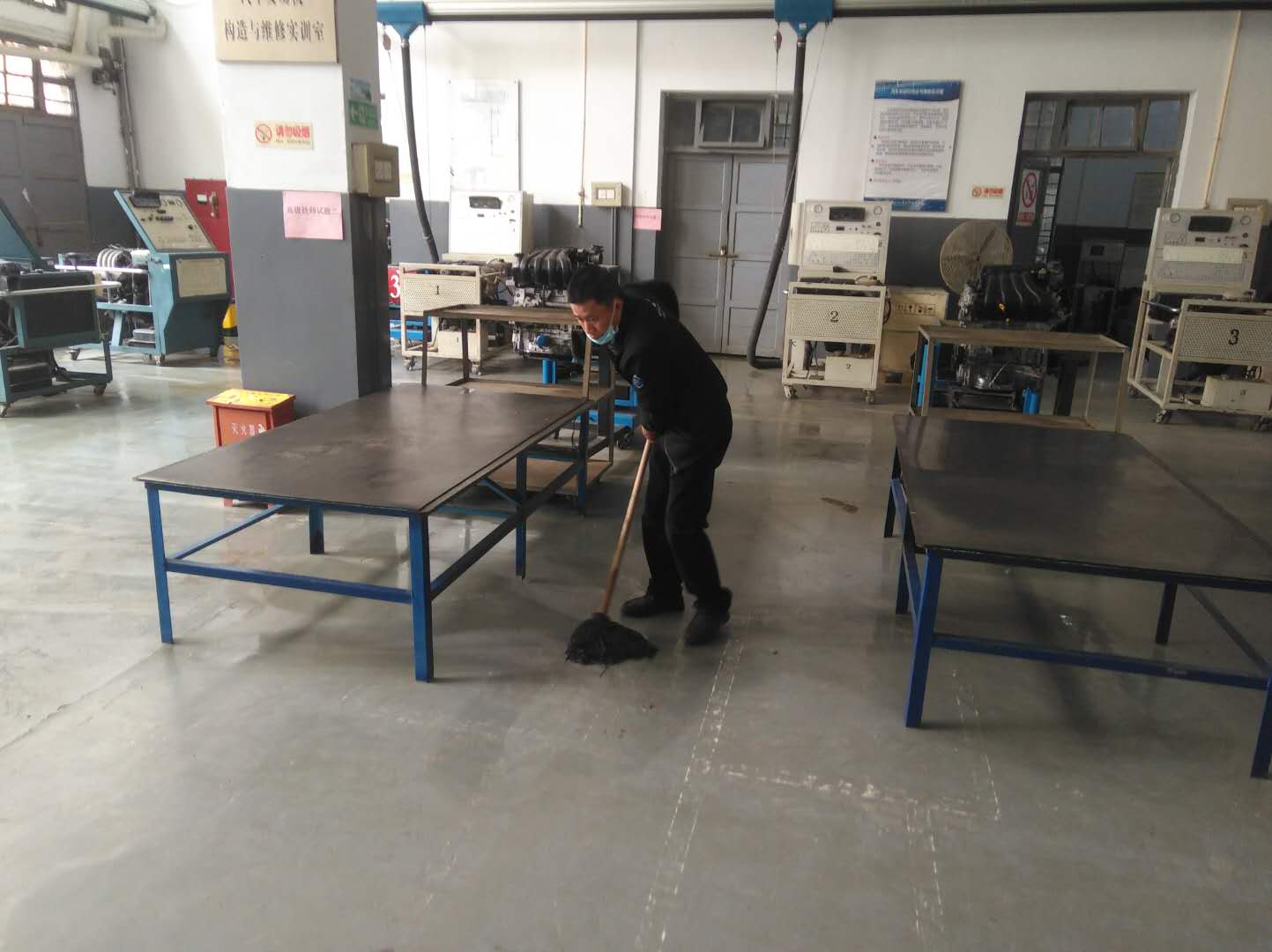 在學(xué)校值班的蔡華錦書記以身作則,拿起拖把加入了實訓(xùn)室的抗“疫”工作,與許紹炎老師、黃林火老師、陳建華老師一起認(rèn)真地打掃了新能源實訓(xùn)室、發(fā)動機構(gòu)造與維修實訓(xùn)室和底盤構(gòu)造與維修實訓(xùn)室。
