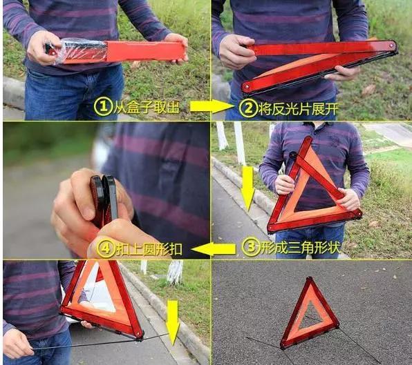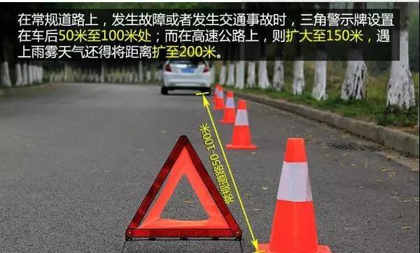當(dāng)汽車(chē)在行駛當(dāng)中出現(xiàn)異常,需要緊急靠邊停車(chē)進(jìn)行輪胎更換時(shí),須拉好手剎、打開(kāi)雙閃警報(bào)燈,一定要按規(guī)定擺放三角警示牌,具體操作如下如所示: