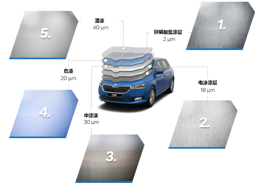 對于汽車而言,車漆除了具有裝飾性外,還具有防腐、防銹、耐高低溫、耐污、耐沖擊等防護(hù)性能。因此,原廠車漆不只簡單的一層,而一般是由鋅磷酸鹽、電泳漆、中涂漆、色漆和清漆等涂層組成。
