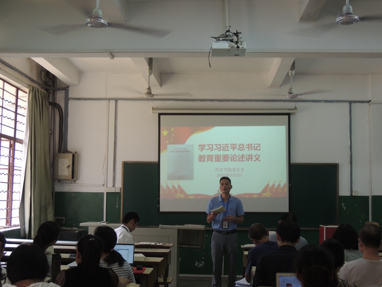 2020年9月2日下午汽車學(xué)院黨總支在10號樓104教室召開全體教職工大會,會上黨總支書記蔡華錦組織教職工學(xué)習(xí)《習(xí)近平總書記教育重要論述講義》,蔡華錦要求各黨支部要通過集中宣講、專題講座、集中研討等多種方式,組織師生認(rèn)真使用《講義》,交流學(xué)習(xí)心得、撰寫學(xué)習(xí)體會,全體師生深入學(xué)習(xí)貫徹習(xí)近平總書記關(guān)于教育的重要論述的科學(xué)內(nèi)涵、核心要義、精神實(shí)質(zhì)、實(shí)踐要求、重大意義,更好地用這一重要論述武裝頭腦、指導(dǎo)實(shí)踐、推動工作。