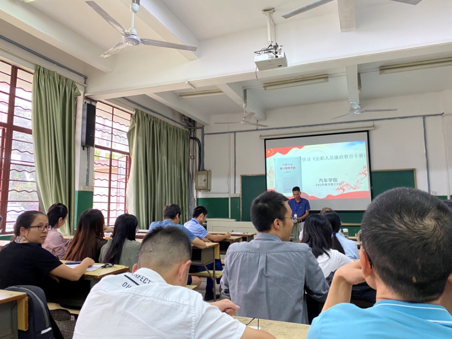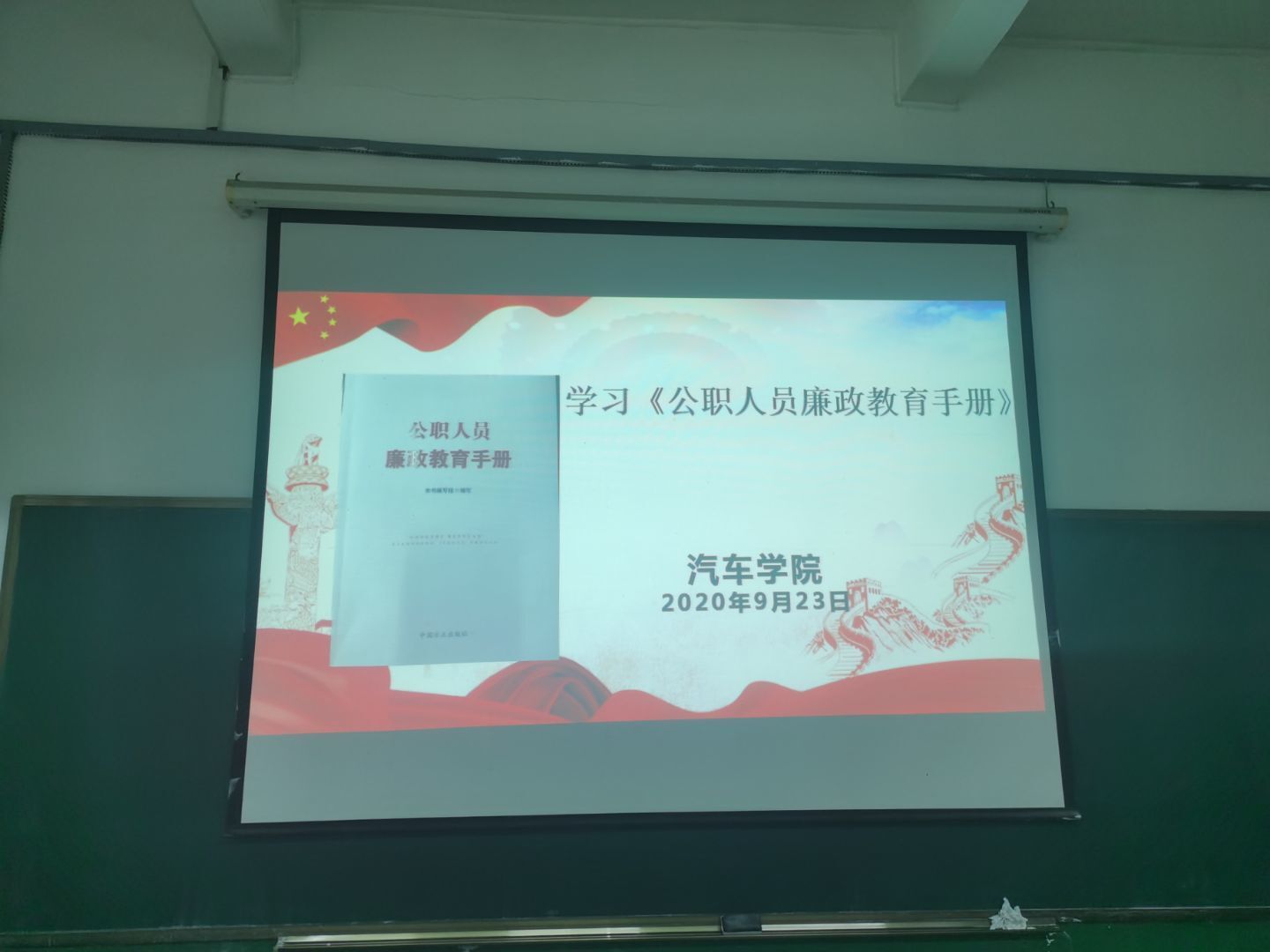 為貫徹落實(shí)學(xué)院全面從嚴(yán)治黨工作會議精神,進(jìn)一步抓好黨員干部的廉政教育工作。2020年9月23日下午汽車學(xué)院黨總支組織全體教職工學(xué)習(xí)《公職人員廉政教育手冊》?!妒謨浴窂恼渭o(jì)律和政治規(guī)矩、廉潔從政從業(yè)、依法履職、組織人事、生活社交等五個方面,梳理分析了黨員干部、公職人員從業(yè)過程中可能遇到的問題和風(fēng)險(xiǎn)點(diǎn),具有較強(qiáng)的政治性、思想性和指導(dǎo)性。