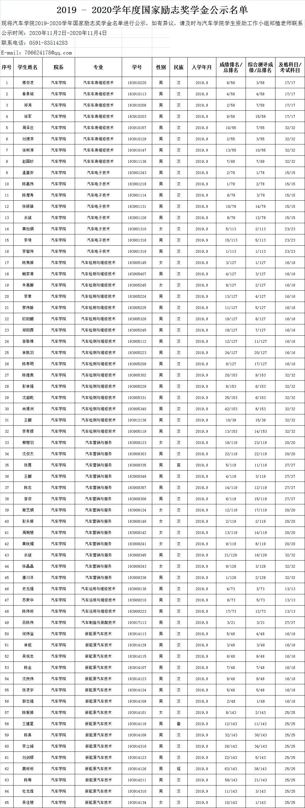 2019-2020學(xué)年度國(guó)家勵(lì)志獎(jiǎng)學(xué)金公示名單