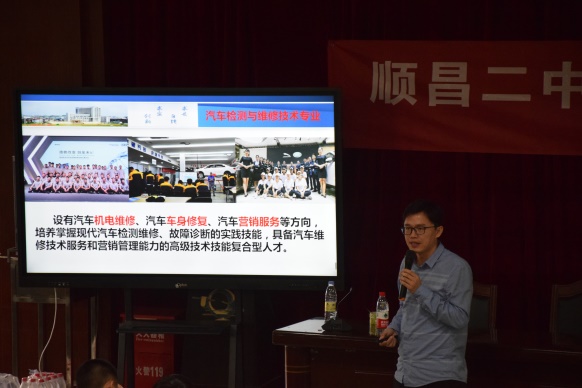 活動分為主題講座和技能實操兩個部分。在順昌二中,林可春副院長解讀了目前國家的職業(yè)教育政策,梁霖鋒老師介紹了汽車學(xué)院的專業(yè)設(shè)置、職業(yè)崗位發(fā)展,企業(yè)專家陳育彬作為優(yōu)秀畢業(yè)生代表分享了自己求學(xué)及成長為省級技能大師的經(jīng)歷,而陳小紅作為順昌籍的優(yōu)秀畢業(yè)生,分享了從學(xué)校畢業(yè)到成功創(chuàng)業(yè)的故事。同學(xué)們聽后紛紛表示,這讓他們了解了職業(yè)教育,也對他們職業(yè)發(fā)展方向的規(guī)劃以及職業(yè)態(tài)度的培養(yǎng)有很大的促進(jìn)作用。