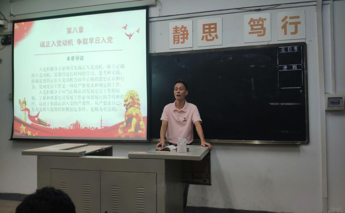 開班儀式后蔡華錦書記為學(xué)員上《明確中國(guó)共產(chǎn)黨黨員的條件和義務(wù)、權(quán)利》、《端正入黨動(dòng)機(jī),爭(zhēng)取早日入黨》的黨課。作為申請(qǐng)入黨和已經(jīng)入黨的人都必須了解中國(guó)共產(chǎn)黨黨員的條件,加入黨組織的成員既要履行一定的義務(wù),同時(shí)也享有黨章所規(guī)定的一定的權(quán)利。忠實(shí)履行黨員義務(wù)和積極行使黨員權(quán)利是黨員先進(jìn)性的集中體現(xiàn),說明了黨員義務(wù)與權(quán)利兩者間辯證統(tǒng)一、相輔相成的關(guān)系。確立正確的入黨動(dòng)機(jī),需要經(jīng)過長(zhǎng)時(shí)間的學(xué)習(xí)、思考和實(shí)踐,特別是要糾正在入黨動(dòng)機(jī)方面不正確的思想認(rèn)識(shí)和行為,同學(xué)們要樹立正確的入黨動(dòng)機(jī),加強(qiáng)思想修養(yǎng),提高政治素質(zhì),嚴(yán)于律己,樹立為人民服務(wù)的理念,從小事做起,堅(jiān)定理想信念,發(fā)揮黨員的先鋒模范作用。在場(chǎng)的同學(xué)們認(rèn)真聆聽,牢牢記住了蔡華錦書記講授的內(nèi)容和寄予的期望。