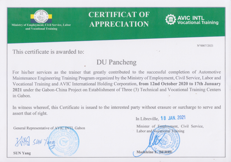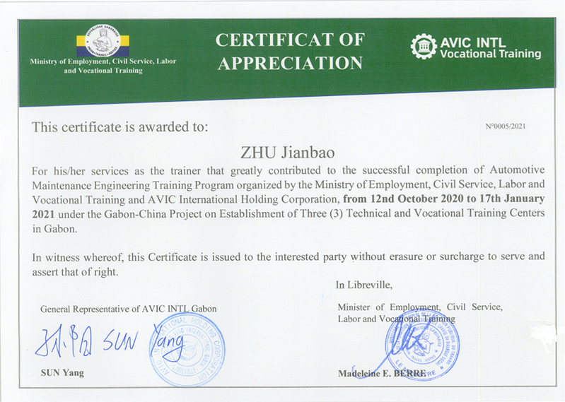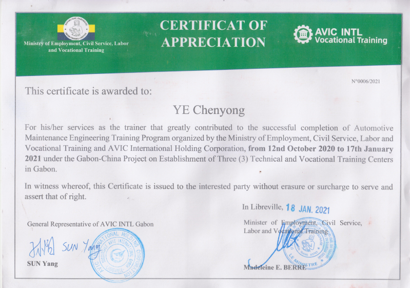 在中航國際、3位教師和譯員們的大力合作和支持下,培訓(xùn)組通過管理創(chuàng)新克服了培訓(xùn)初期的各種困難,最終在防疫零感染的前提下,順利完成了為期14周的汽修專業(yè)師資培訓(xùn)。學(xué)員考試平均分?jǐn)?shù)87.89,高于講師制定的85分標(biāo)準(zhǔn)線。加蓬國家、學(xué)員和中航國際對三位教師的培訓(xùn)水平給予很高的評價。加蓬勞工部專門分別對三位教師頒發(fā)了嘉獎狀。