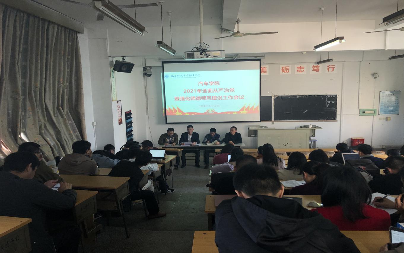 2021年3月17日下午,汽車學(xué)院召開2021年深化全面從嚴(yán)治黨暨強(qiáng)化師德師風(fēng)建設(shè)工作部署會,并舉行黨風(fēng)廉政責(zé)任書簽訂儀式。汽車學(xué)院黨總支蔡華錦書記主持會議,全體班子成員、黨員領(lǐng)導(dǎo)干部和教職工參加了會議。