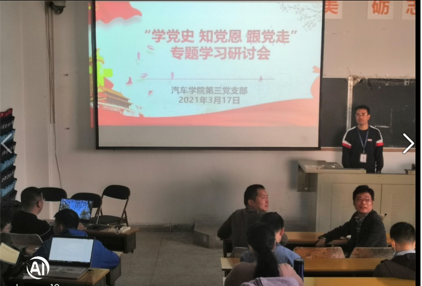 根據(jù)學(xué)院“再學(xué)習(xí)、再調(diào)研、再落實(shí)”活動(dòng)工作部署要求,深入開(kāi)展黨史學(xué)習(xí)教育,2021年3月17日下午,汽車(chē)學(xué)院第三黨支部于汽西22號(hào)樓第二階梯教室教室開(kāi)展“學(xué)黨史 知黨恩 跟黨走”專(zhuān)題學(xué)習(xí)研討會(huì)。