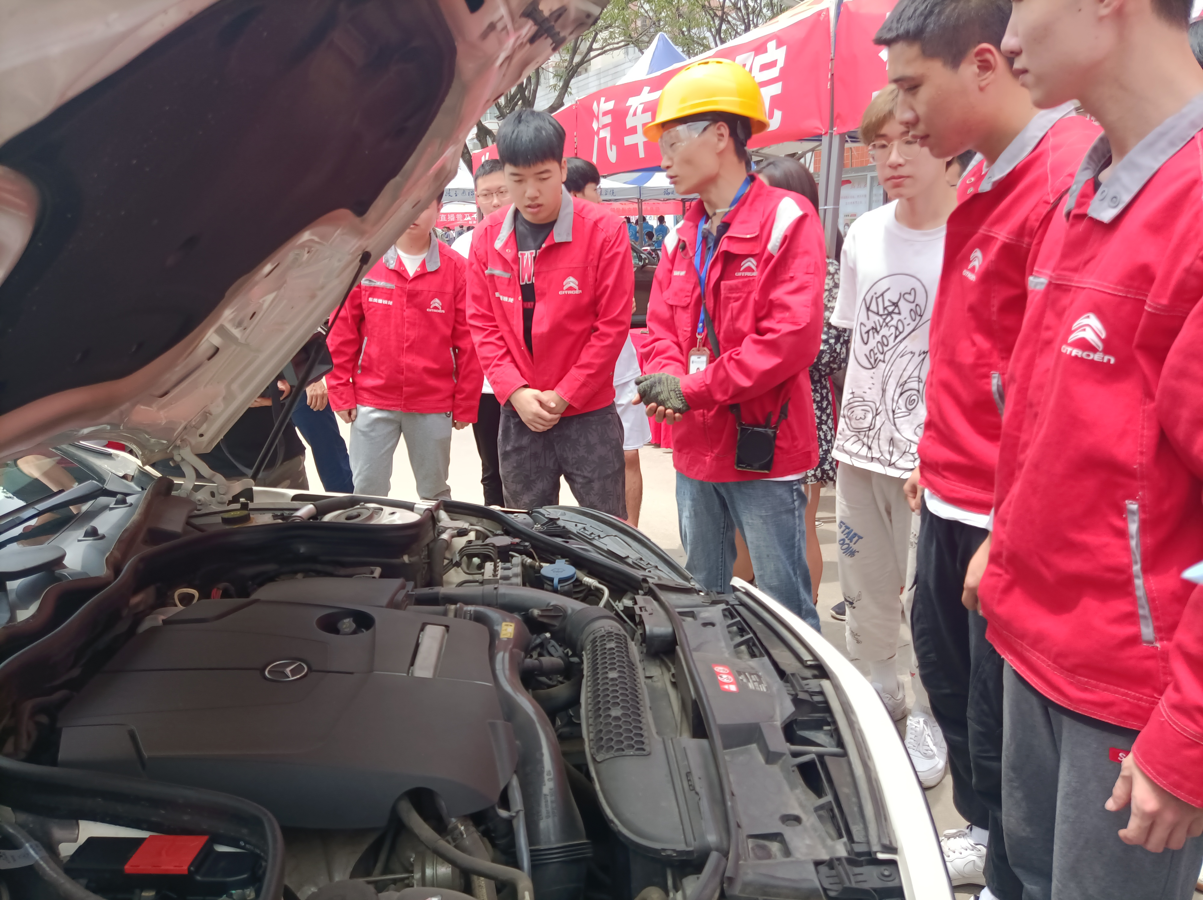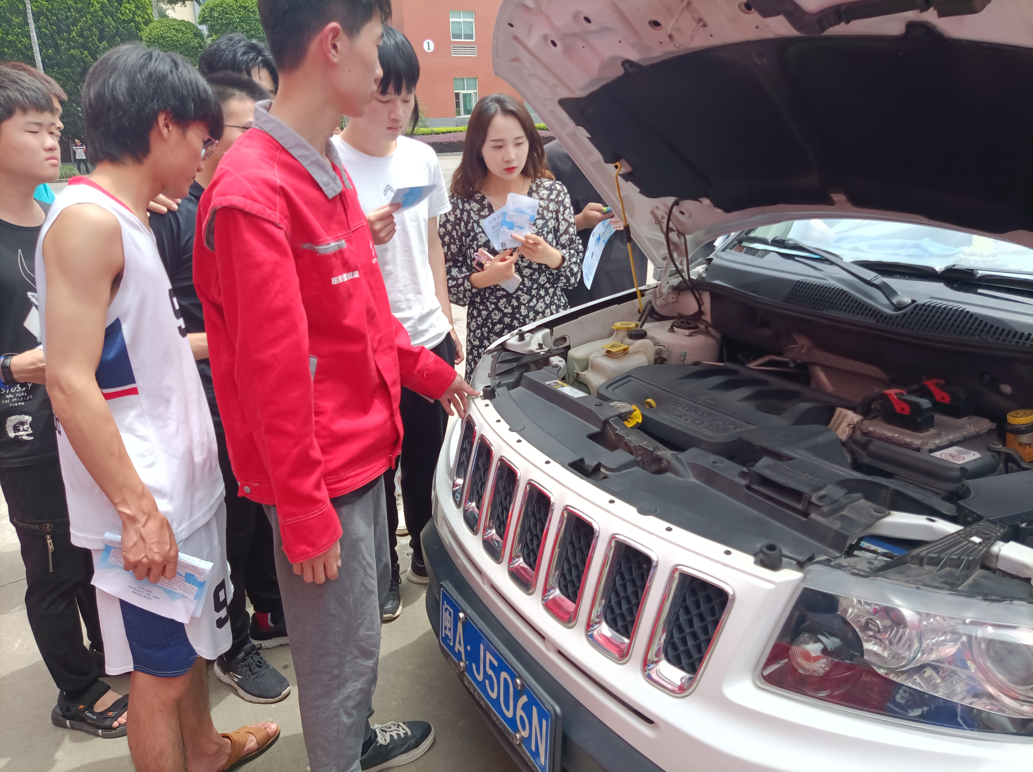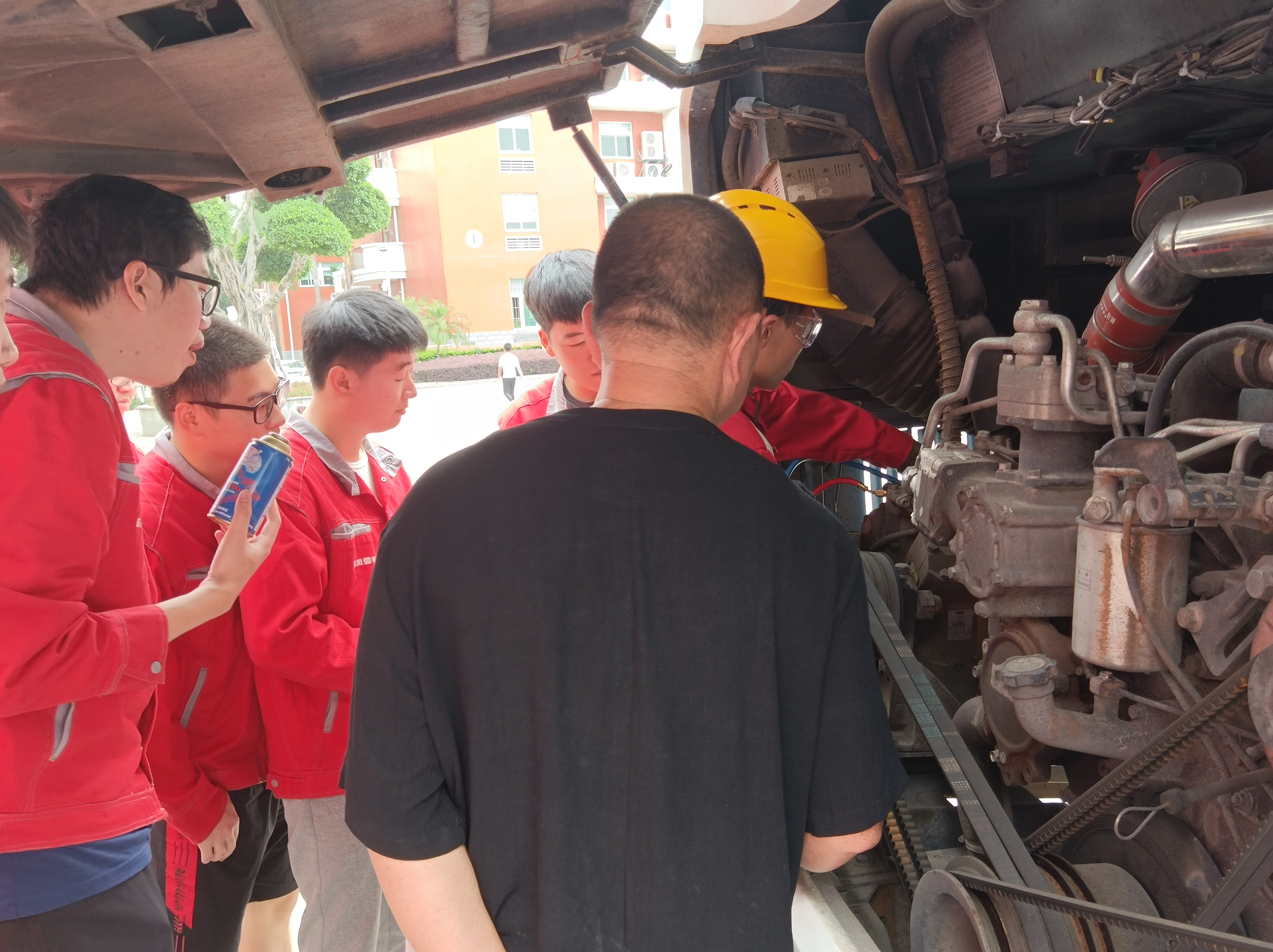 操場上,一輛接一輛的汽車開進(jìn)來檢測,學(xué)生們興致很高,紛紛表示收獲滿滿,把自己平時所學(xué)用到實(shí)際工作中覺得很有成就感,并希望能有跟多實(shí)踐機(jī)會。通過職教活動,真實(shí)接觸各種不同車型的空調(diào)系統(tǒng),大開了眼界。同時,應(yīng)部分教師要求,還現(xiàn)場介紹了其它汽車維護(hù)應(yīng)急的措施,比如輪胎氣壓不足的充氣操作,備胎的更換等。