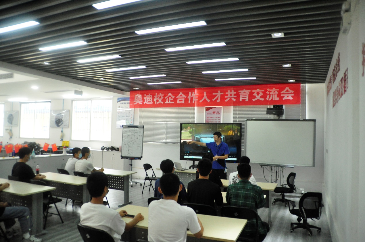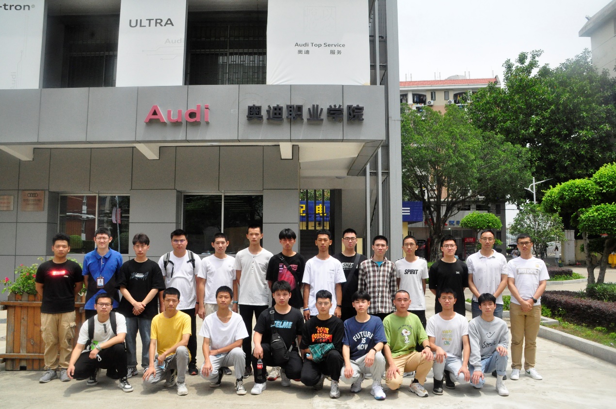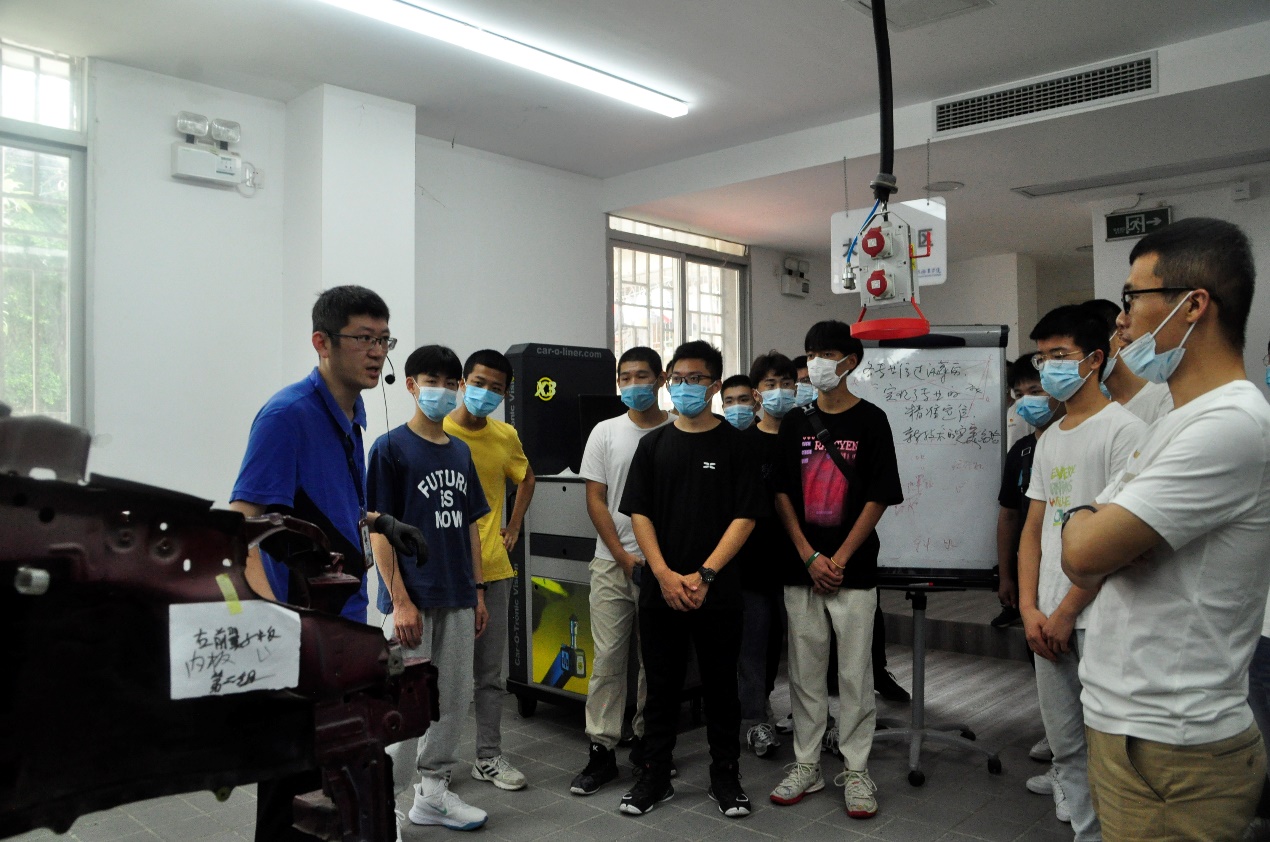 上午9點(diǎn)半,由福建理工學(xué)校魏日成老師和伍英賢老師帶領(lǐng)的20名中職學(xué)生,乘坐大巴來到南區(qū)的奧迪實(shí)訓(xùn)中心。汽車學(xué)院的黃知秋老師帶領(lǐng)理工學(xué)校的老師和同學(xué)們參觀了一樓的奧迪機(jī)電實(shí)訓(xùn)室和二樓的鈑金實(shí)訓(xùn)室。