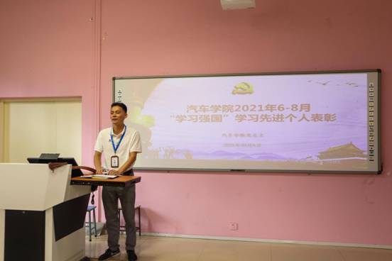 為進(jìn)一步學(xué)好用好“學(xué)習(xí)強(qiáng)國”學(xué)習(xí)平臺,持續(xù)深入學(xué)習(xí)宣傳貫徹習(xí)近平新時代中國特色社會主義思想,推動汽車學(xué)院廣大黨員、干部廣泛運(yùn)用“學(xué)習(xí)強(qiáng)國”學(xué)習(xí)平臺開展好網(wǎng)上學(xué)習(xí),提高學(xué)習(xí)積極性,形成“比學(xué)趕超”濃郁氛圍,2021年10月6日下午,汽車學(xué)院在2號樓1-3教室,舉行“學(xué)習(xí)強(qiáng)國”優(yōu)秀先進(jìn)個人表彰會,汽車學(xué)院全體教職工黨員參加本次會議,會議由蔡華錦書記主持。