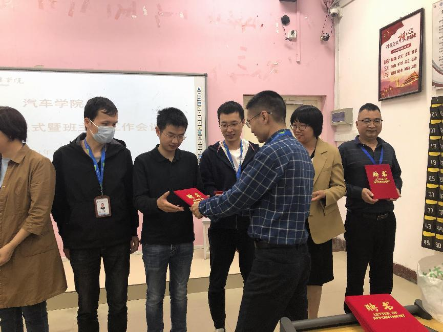 會(huì)議第二項(xiàng)議程,蔡華錦書記和汽車學(xué)院院長(zhǎng)蘇慶列分別為2021級(jí)新聘任的班主任代表頒發(fā)聘任證書。
