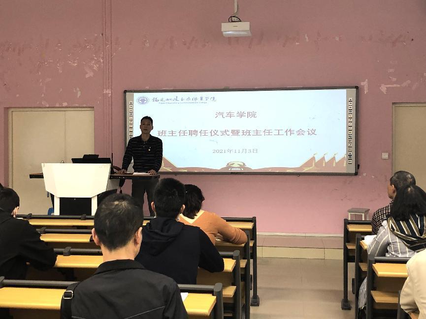 為貫徹落實(shí)《中共中央國(guó)務(wù)院關(guān)于加強(qiáng)和改進(jìn)新形勢(shì)下高校思想政治工作的意見(jiàn)》、教育部《關(guān)于加強(qiáng)高等學(xué)校輔導(dǎo)員班主任隊(duì)伍建設(shè)的意見(jiàn)》等文件精神,加強(qiáng)班主任隊(duì)伍建設(shè),切實(shí)提高班主任的學(xué)生管理工作成效,2021年11月3日下午,汽車學(xué)院在2#1-3教室開(kāi)展2021級(jí)班主任聘任儀式暨班主任工作會(huì)議。會(huì)議由汽車學(xué)院黨總支書記蔡華錦主持,汽車學(xué)院黨政領(lǐng)導(dǎo)班子成員、全體輔導(dǎo)員及各年級(jí)班主任參加了會(huì)議。