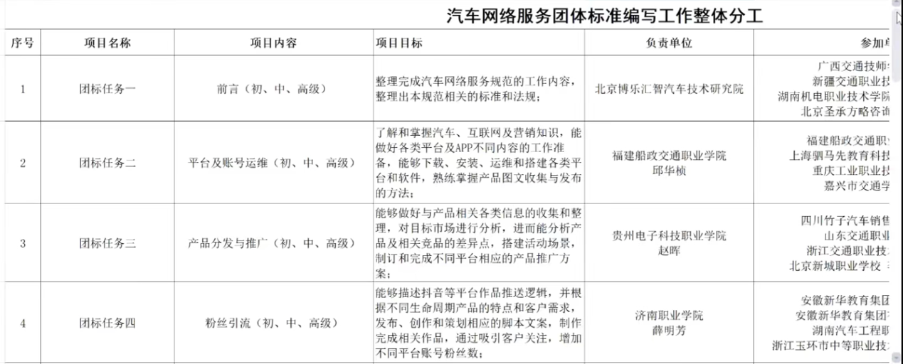 本次會議還對汽車網(wǎng)絡(luò)服務(wù)團(tuán)體標(biāo)準(zhǔn)編寫工作進(jìn)行明確分工。每個任務(wù)都由學(xué)院老師、企業(yè)和專家組成;每個任務(wù)中的負(fù)責(zé)單位負(fù)責(zé)召開會議,解決編寫過程中的問題。