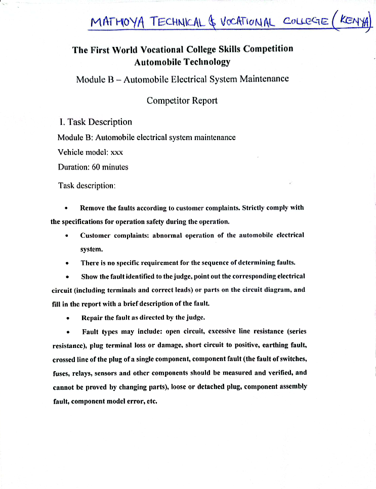 2022年8月12日,首屆世界職業(yè)院校技能大賽“汽車(chē)技術(shù)”賽項(xiàng)在天津開(kāi)賽。賽項(xiàng)首次創(chuàng)新組隊(duì)模式,采取“1+1”手拉手中外聯(lián)合組隊(duì),并設(shè)立以天津交通職業(yè)學(xué)院為主賽場(chǎng)和其余8個(gè)分賽場(chǎng)的線上線下競(jìng)賽模式。本次比賽我校的沈洪松和劉建輝以及肯尼亞Mathioya Technical and Vocational College的Godffrey Gathungu和Emeldah Wakarindi聯(lián)合組隊(duì),在比賽中取得了第四名的優(yōu)異成績(jī)。