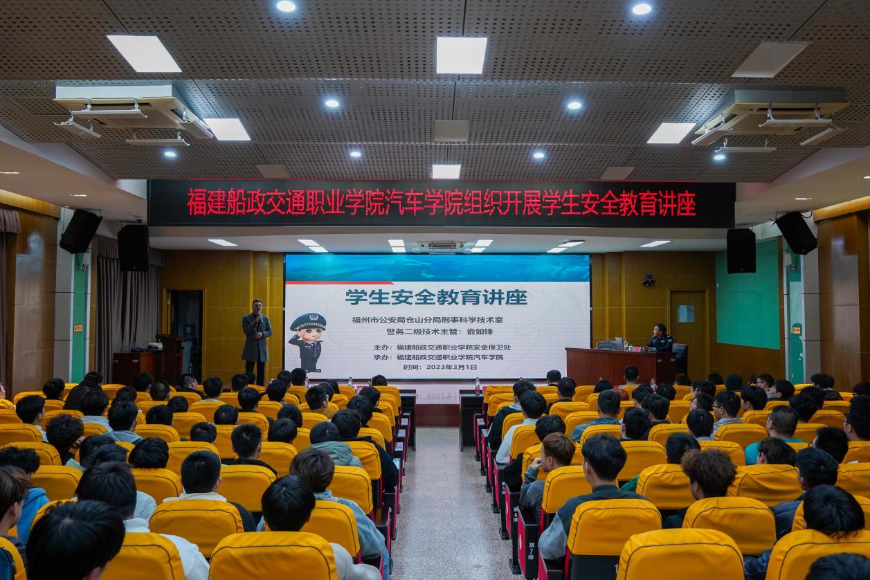 為加強(qiáng)學(xué)生安全教育,普及安全知識,提高學(xué)生自我保護(hù)意識,3月1日晚上7點(diǎn),由福建船政交通職業(yè)學(xué)院安全保衛(wèi)處主辦、汽車學(xué)院承辦的學(xué)生安全教育講座在1號樓學(xué)術(shù)報(bào)告廳開展。本次講座由福州市公安局倉山分局刑事科學(xué)技術(shù)室警務(wù)二級技術(shù)主管俞如鋒警官主講。