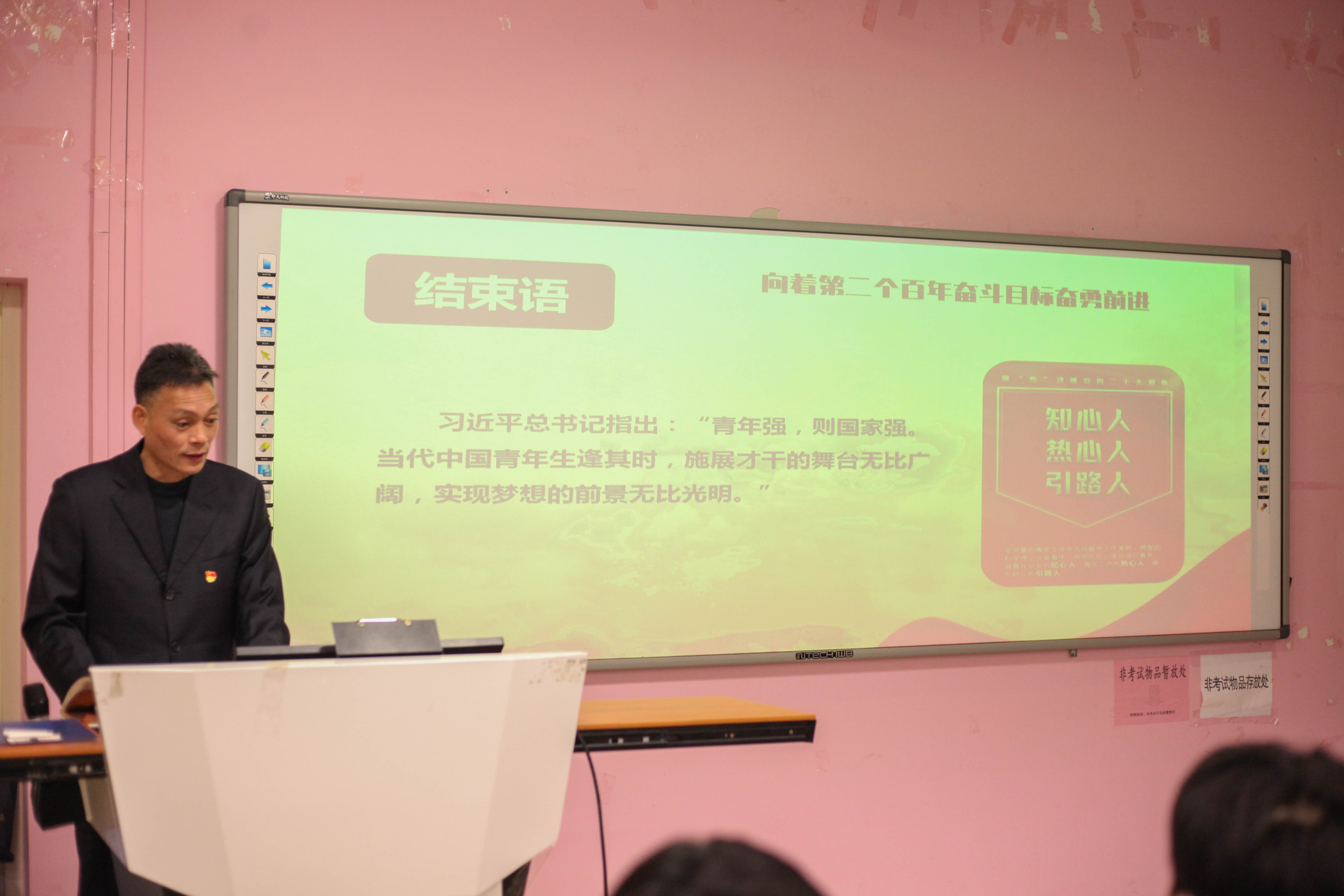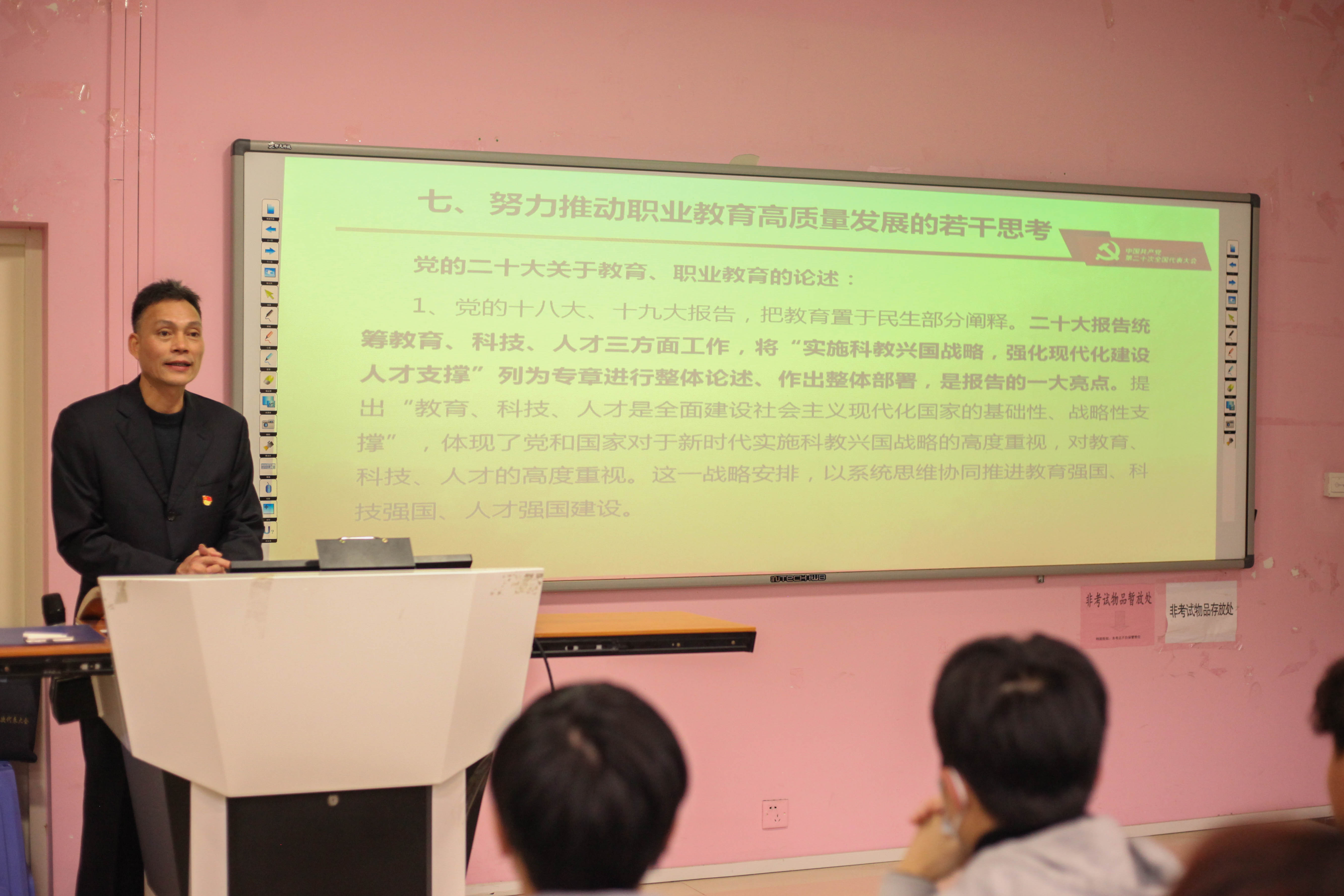 蔡華錦書(shū)記從“黨的二十大主題:大會(huì)內(nèi)容和精神的高度概括”、“過(guò)去5年的工作和新時(shí)代10年的偉大變革”、“開(kāi)辟馬克思主義中國(guó)化時(shí)代化新境界”、“以中國(guó)式現(xiàn)代化全面推進(jìn)中華民族偉大復(fù)興”、“黨和國(guó)家事業(yè)的新部署新要求”、“堅(jiān)定不移推進(jìn)全面從嚴(yán)治黨的部署和要求”、“努力推動(dòng)職業(yè)教育高質(zhì)量發(fā)展的若干思考”七個(gè)方面展開(kāi)宣講。引導(dǎo)青年學(xué)生們對(duì)中國(guó)式現(xiàn)代化知其然、知其所以然,弘揚(yáng)偉大建黨精神,自信自強(qiáng)、守正創(chuàng)新,踔厲奮發(fā),勇毅前行,以更飽滿的精神面貌貢獻(xiàn)自己的青春力量。