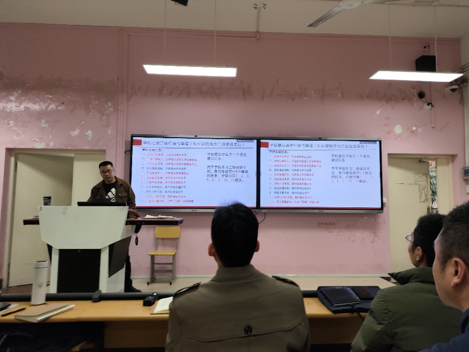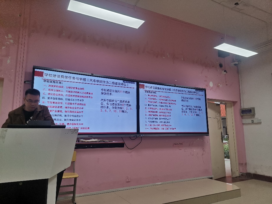 會(huì)上,朱劍寶副院長為全體教職工介紹了國家“雙高”建設(shè)計(jì)劃,從每個(gè)模塊梳理了汽車學(xué)院對(duì)“雙高”任務(wù)做出的成果,同時(shí)也肯定了大家對(duì)汽車學(xué)院做出的重大貢獻(xiàn)。