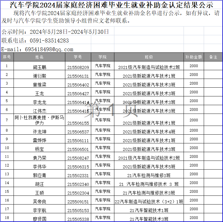 汽車學院2024屆家庭經濟困難畢業(yè)生就業(yè)補助金認定結果公示