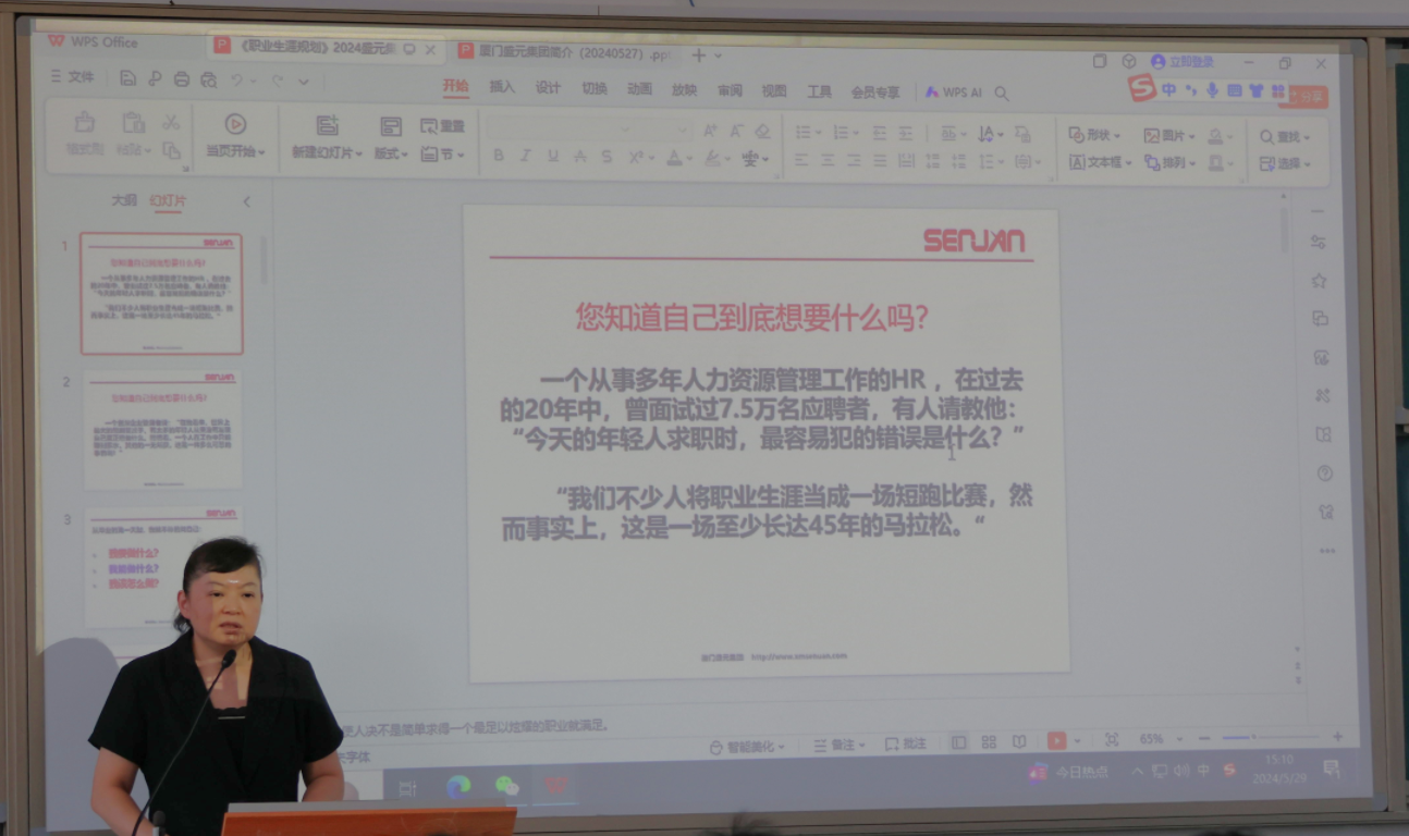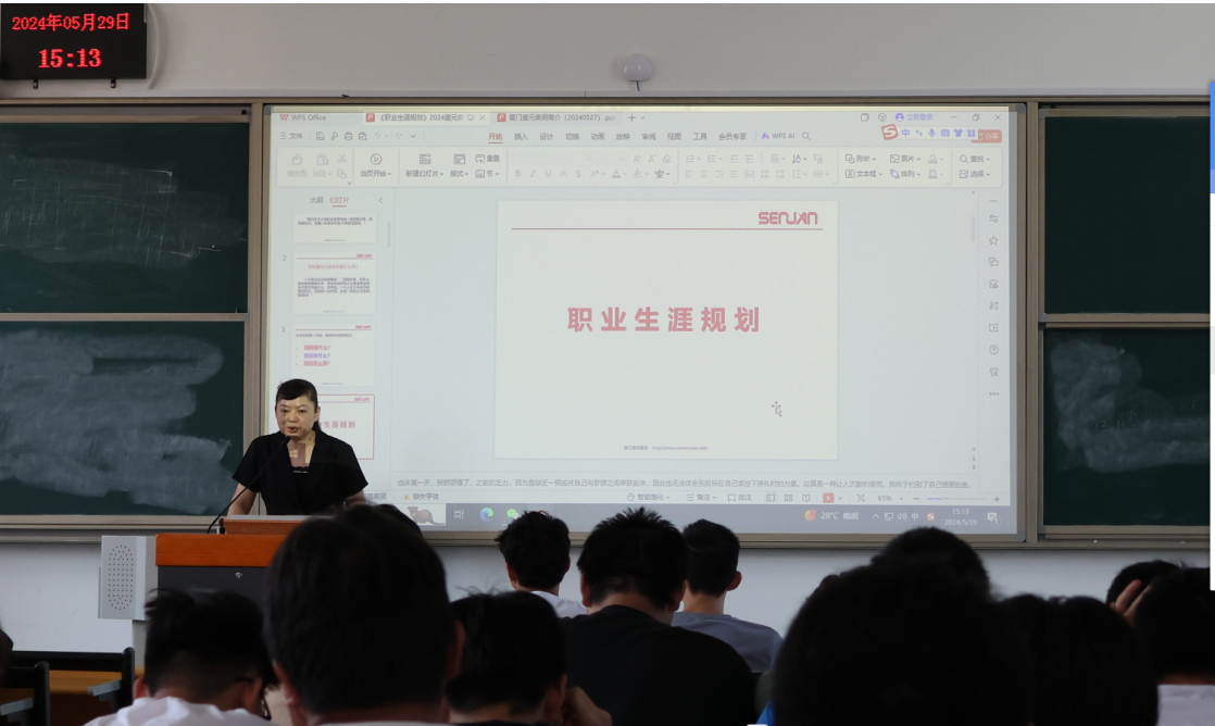 為了讓學(xué)生提前了解企業(yè)需求和行業(yè)動(dòng)態(tài),有針對(duì)性地提升自己的技能和素質(zhì),提高就業(yè)的適配性和成功率,同時(shí)也為企業(yè)儲(chǔ)備人才,加強(qiáng)校企合作,給即將走出校園的學(xué)子提供更多了解職場(chǎng)、做好職業(yè)生涯規(guī)劃。2024年5月29日下午,汽車學(xué)院邀請(qǐng)廈門盛元集團(tuán)資深人事總監(jiān)黃蓉女士為2022級(jí)部分學(xué)生做了一場(chǎng)精彩的職業(yè)生涯規(guī)劃講座。