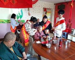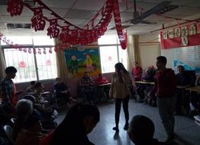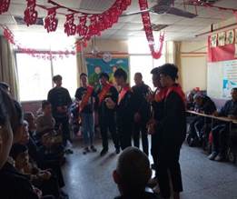 在敬老院里,志愿者們受到了敬老院領(lǐng)導(dǎo)和老人們的熱情歡迎。本次活動(dòng)大體將志愿者分為兩組,分別去一樓大廳和二樓大廳與老人們聊天解悶。志愿者們?yōu)槔先怂蜕狭宋繂柶?,這一份份慰問品蘊(yùn)涵著志愿者們對(duì)老人們的深深敬意與祝福,大家又親切地圍在老人們的身邊陪他們聊聊天,為他們捶捶背、捏捏肩,為老人們表演了一系列精心的節(jié)目。